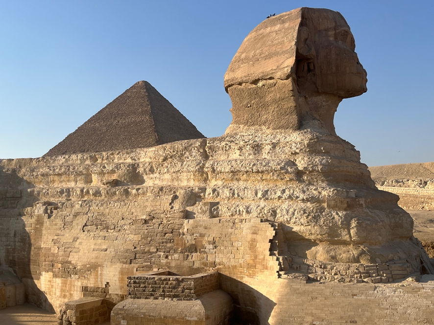 A Grande Esfinge de Gizé é um dos monumentos mais enigmáticos da Antiguidade. Fica no planalto de Gizé, próximo às pirâmides, nos arredores do Cairo. A maioria dos egiptólogos acredita que a esfinge foi construída por volta de 2.500 a.C. durante o reinado do faraó Quéfren, da IV dinastia do Antigo Império. Essa hipótese se baseia na proximidade com a pirâmide de Quéfren, a semelhança do rosto com estátuas atribuídas a ele e evidências arqueológicas do complexo funerário. A Esfinge simboliza a força, pelo corpo de leão, a sabedoria e o poder real, pela cabeça humana e a associação do faraó ao deus solar. Provavelmente representava o próprio faraó, como uma manifestação divina protetora da necrópole de Gizé.