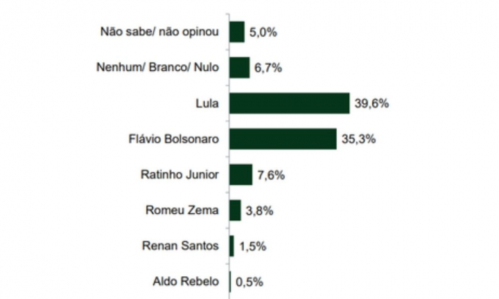 No principal confronto testado, Flávio registra 35,3% das intenções de voto, enquanto Lula tem 39,6%